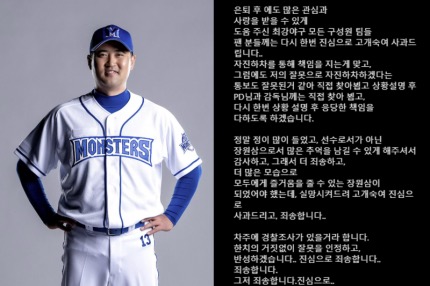 장원삼은 “보도된 내용대로 음주운전 접촉 사고를 낸 게 맞다. 변명의 여지가 없다"면서 "저로 인해 어제 사고를 당하신 분과 가족, 지인, 팬분들 그리고 현재 출연 중인 방송 관계자, 감독님, 선수분들, 팬분들 모두에게 피해와 심려 끼쳐드려서 정말 죄송하다"고 사과했다.