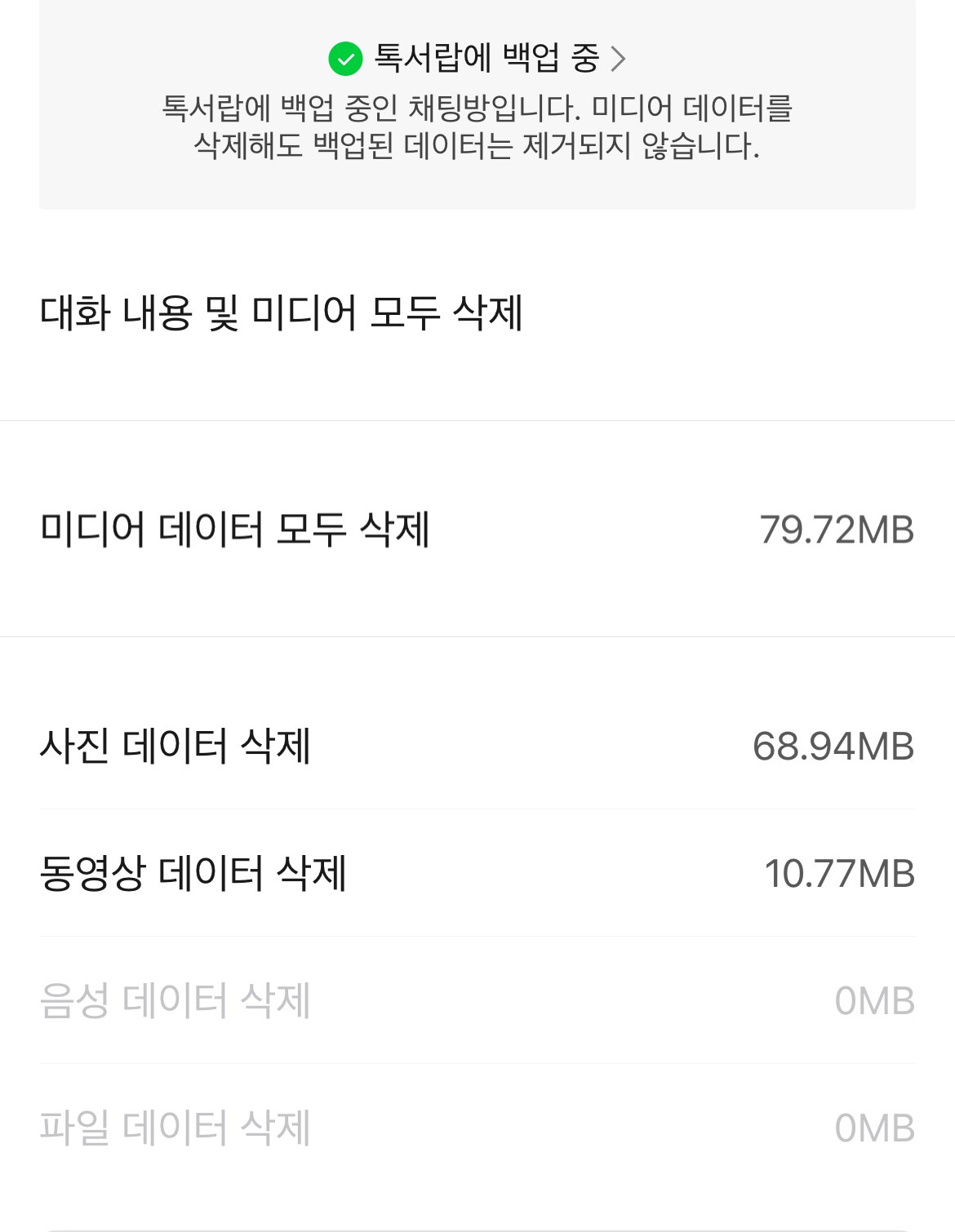 여기서 중요한 것은 백업이다. 월 1900원씩 내는 톡서랍을 이용하는 사람들은 ‘톡서랍 백업 중’이 설정되어 있으면 마음 놓고 삭제해도 된다. 채팅방마다 설정이 다를 수 있는데, 이럴 경우 미디어 데이터를 삭제해도 백업된 데이터는 톡서랍에 남게된다.