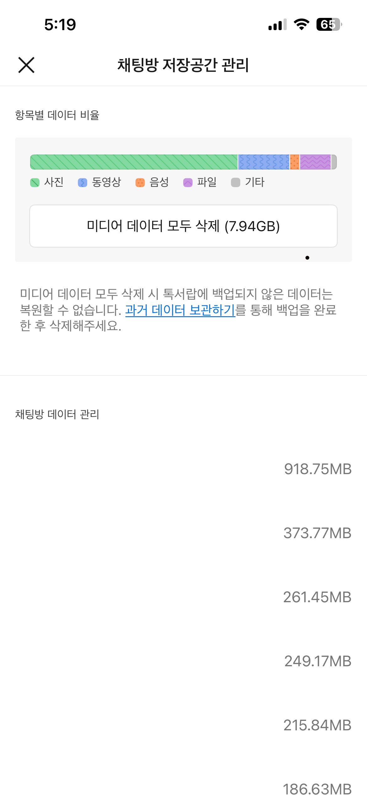 그러면 하단의 사진처럼 ‘항목별 데이터 비율’과 그 밑의 ‘채팅방 데이터 관리’가 나온다. 보통 데이터 크기 순서대로 나오기에 각 방에 들어가 하나하나 필요 없는 데이터를 삭제하면 된다.