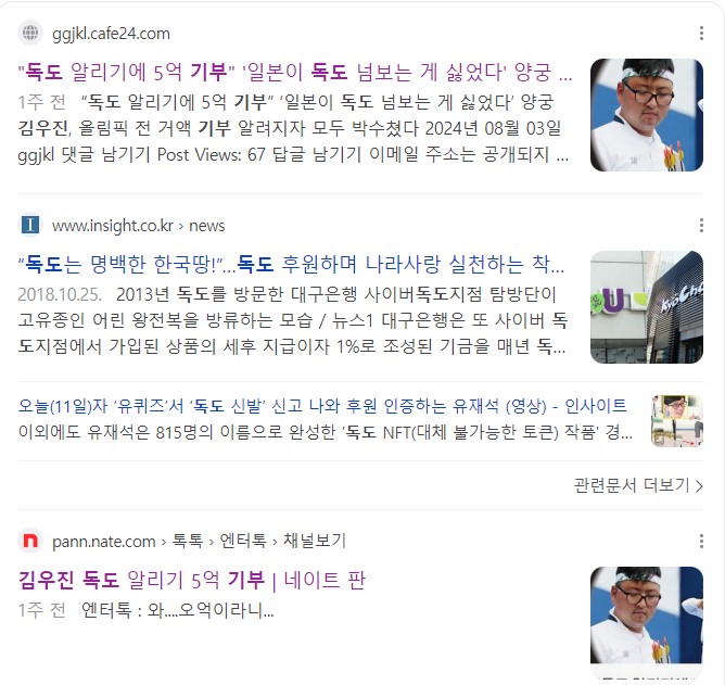 그런데 뜬금없이 김우진이 독도에 대회 전 ‘독도 알리기’에 5억을 기부했고, 이와 관련해 인터뷰까지 했다는 글이 돌기 시작했다 실제 포털에서 ‘김우진 독도’를 치면 ‘김우진 독도’ ‘김우진 독도기부’라는 키워드가 자동으로 완성된다.