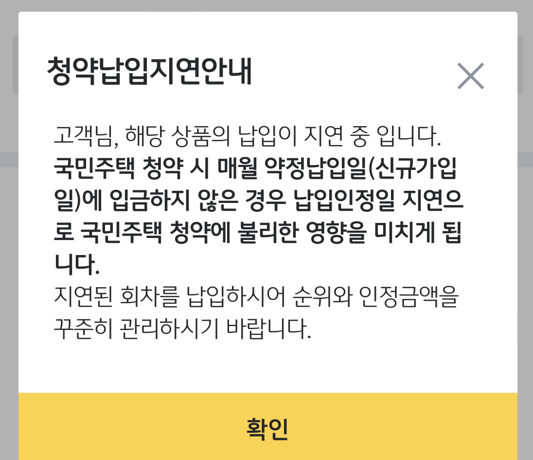 즉 지연 안내가 뜬다고 해서 뭐가 잘못되거나 한 것은 아니다. 100회차 정도에 600만원 정도 납입이 되어 있다면 기본적으로 청약에 어느 정도 유리한 입장이다. (이는 하단에 기재)
