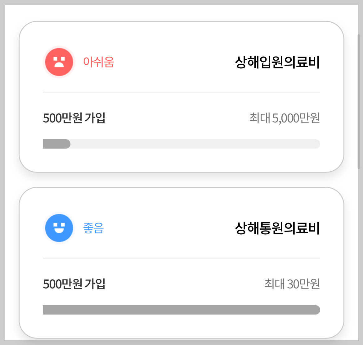 다시 말해 상해입원의료비는 최대 5000만원이지만, 입원할 경우만 이용할 수 있는 금액이고, 상해통원의료비는 최대 30만원까지만 가능하다. 그래서 하나는 아쉽게, 하나는 좋음으로 나온 것이다.