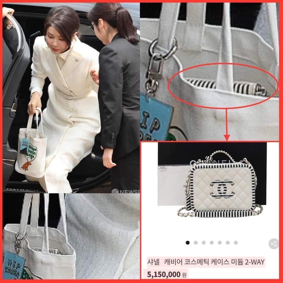 같은 종류라고 주장하는 이들은 이게 ‘샤넬 캐비어 코스메틱 케이스 미듐 2-WAY’라고 주장한다. 이 백은 현재 대략 515만원 정도 한다고 알려졌다. 김건희가 이 샤넬 백을 가지고 있는 것은 문제가 안된다. 뭐 본인 돈도 있고 하니 말이다. 그러나 사람들은 에코백 안에 이 샤넬백의 존재를 드러내며, 김건희의 ‘서민 코스프레’ ‘앞뒤 다른 행보’를 지적한다.