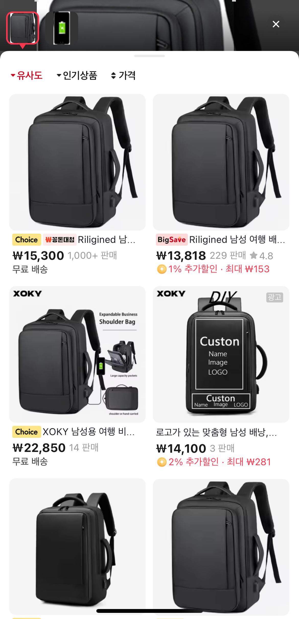 알리 익스프레스에 들어가 상단 검색창에 있는 카메라를 누른다. 그러면 사진을 찍으라고 나오는데, 여기서 하단에 ‘앨범 선택하기’를 올려서 쿠팡이나 G마켓에서 캡쳐해 놓은 사진첩에 있는 사진을 불러온다. 그러면 알리 익스프레스가 알아서 유사한 상품을 찾아준다. 여기서 유사도, 인기상품, 가격을 선택할 수 있는데, 경험상 유사도로 찾는 것이 낮은 가격의 유사 상품을 찾을 확률이 높다.